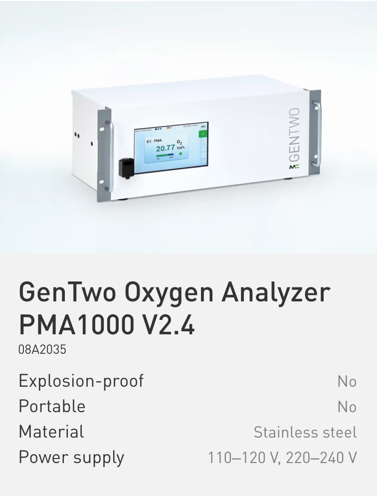 GenTwo oxygen analyzer PMA1000 V2.4, 19″ rack‑mount housing, short, 4 U, gas paths: stainless steel tubing, gas connections: 1/8″ NPT f Swagelok®. Microprocessor‑ controlled HMI with 7″ color touchscreen control panel, equipped with 1 x PMA2 O2 transducer, thermostatted to 55 °C, four linear measuring ranges 0‑1 to 100 vol% O2, 2 of them freely programmable, suppressed zero point possible, process pressure compensation from 0.8 to 1.2 bar abs. Integrated flow measurement and monitoring can be switched on/off, analog output: 1 x 0/4‑20mA, max. 500 ohms, galvanically isolated, digital outputs: 4 x relays (2 x exceeding of operational limits, 2 x measuring range feedback), status relay outputs via potential‑free change‑over contacts: device status, CAL mode, pump I/O, CAL error, interfaces: Ethernet, USB, Modbus TCP, AK protocol TCP. Dimensions (W x H x D): 482 x 185 x 297 mm, power supply: 100‑240 V, 50‑60 H