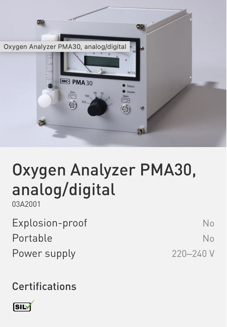 Oxygen analyzer type PMA30A/D with combined analog/digital display in 1/3 of a 19″ plug‑in rack (3 U, 28 HP), signal output: 4 to 20 mA (0 to 20mA on request) with galvanic isolation max. load of 300 Ohm (900 Ohm on request), measuring ranges: from 0 to 1/3/10/30/100 vol% O2, can be pre‑selected at the analyzer or externally, incl. flow meter with needle valve 7 to 70 Nl/h, status signal output for heating, fuse, projection LED and flow, thermostatization of the transducer to +50 °C, power: 230 V/50 Hz